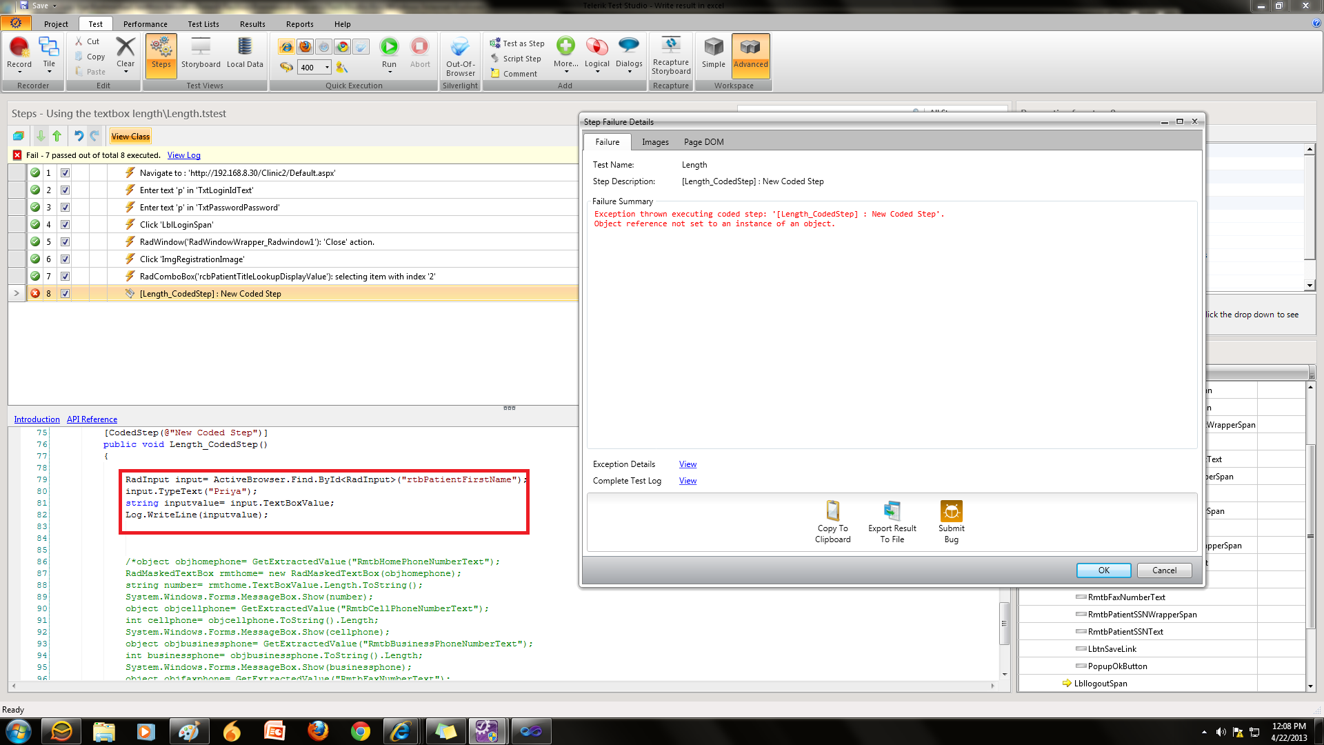 RadInput textbox = Manager.Current.ActiveBrowser.Find.ById<RadInput>("ctl00_ContentPlaceHolder1_RadTextBox1_wrapper");textbox.TypeText("asdfg", 50, 50, false, false);SetExtractedValue("objhomephone", textbox.TextBoxValue.Length);Log.WriteLine(GetExtractedValue("objhomephone").ToString());I recorded a short video with the entire process.