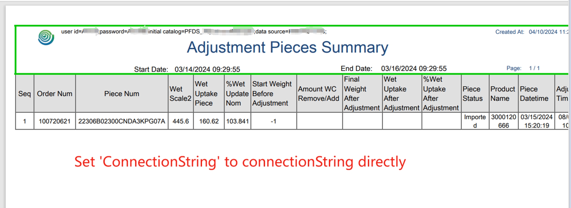But when I set the connection string to the property 'ConnectionString' , it worked. And I tested the parameter rendering, it's also OK. Pls refer the success.png.