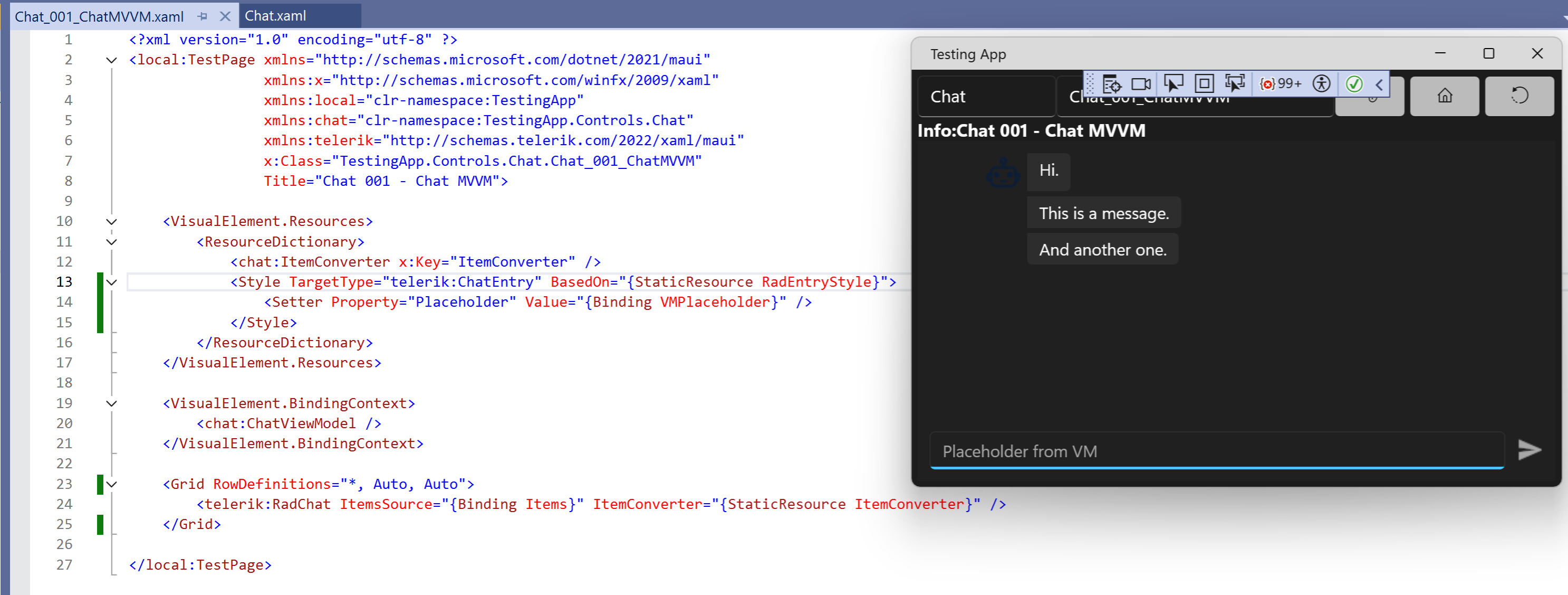 How can I change the placeholder of RadChat from 'Please entry a message' to other value binding to ViewModel like 'ABC...'. I have tried to use