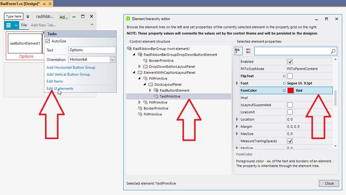I have create the RadRibbonBarGroup in RadRibbonBar. But I want to change the font color in RadRibbonBarGroup, I change the ForeColor to white. It doesn't change the color. It always shows gray color. Please tell how to change the font 'test' color, thanks very much.