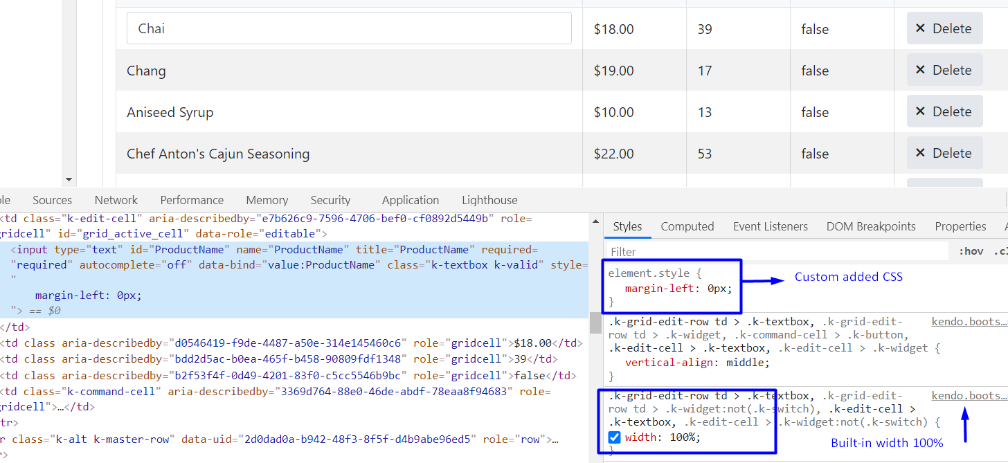 .text-box, .single-line { width: 100%;}.k-edit-cell > .k-textbox, .k-edit-cell > .k-widget, .k-edit-cell > .text-box, .k-grid-edit-row > td > .k-textbox, .k-grid-edit-row > td > .k-widget, .k-grid-edit-row > td > .text-box { margin-left:0px;}
