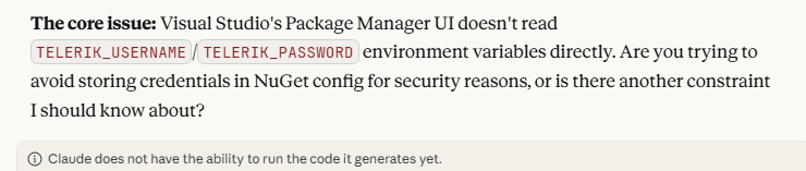 The Claude statement about the environment variables is partially true. The nuget.config file won't search by itself for environment variables - like %TELERIK_USERNAME% and %TELERIK_PASSWORD%. This is a special feature and syntax available on the YAML pipelines supported by GitHub Actions and Azure DevOps. So, if your build runs on one of these systems, then you can use the %var_name% syntax as described in the following blog post.