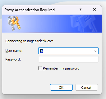 Hello Peter, this dialog is displayed when the Visual Studio package manager tries to access a feed with authentication enabled (like the Telerik one). You need to enter your email address + password used to login to your telerik.com account. This stores the entered credentials in the Windows Credential Manager and in the corresponding nuget.config file (the global one by default).