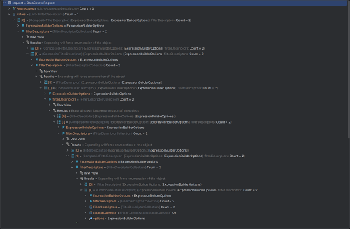 Before we proceed further, could you please share the screenshot with the DataSourceRequest that you are receiving with the multiple levels of nested filters, because the previous screenshot (from 24 October) is blurred and it is almost impossible to read anything. Maybe looking at the structure of the DataSourceRequest might help us determine what is causing the issue.