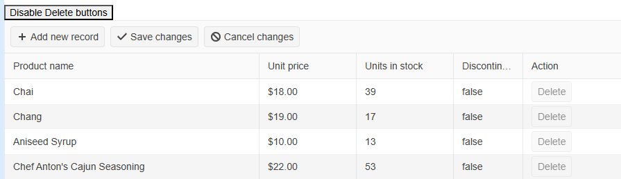 Thank you for sharing the custom Delete command column definition. You can disable the buttons like this: