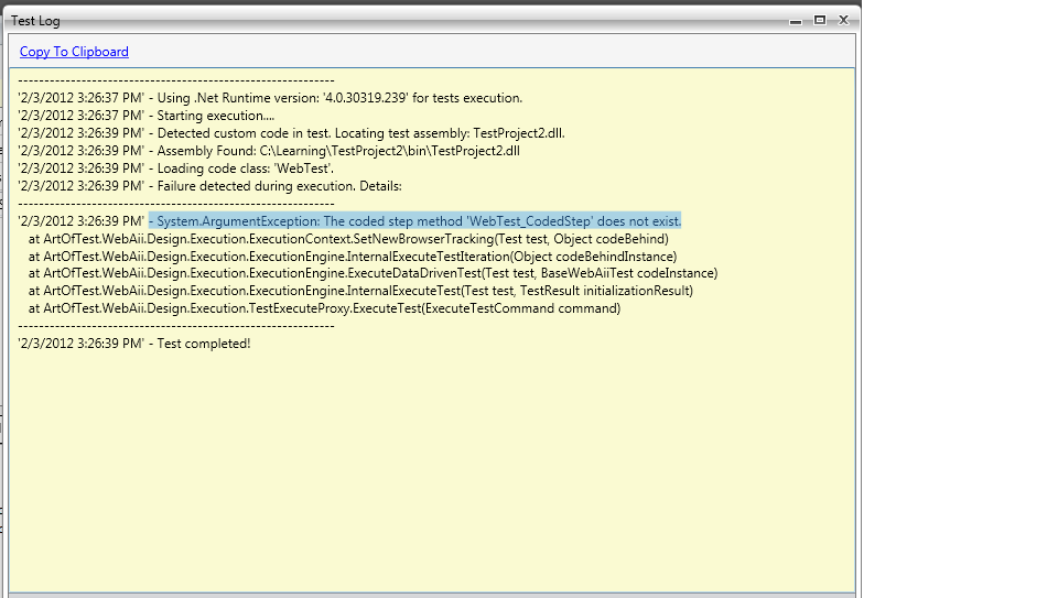 at ArtOfTest.WebAii.Design.Execution.ExecutionUtils.EnsureTypeExists(Assembly assm, String typeName)