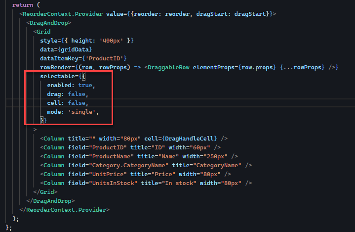 I try to implement drag drop row and selection row in datagrid, So I try your demo code https://www.telerik.com/kendo-react-ui/components/grid/rows/row-reordering/.