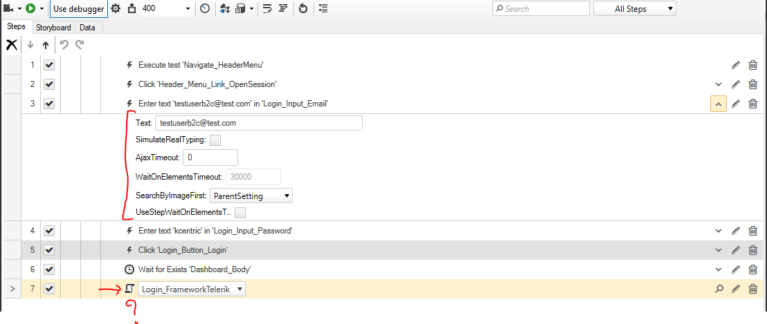 I have a coded step "Login_FrameworkTelerik" that requires input such as "User email".