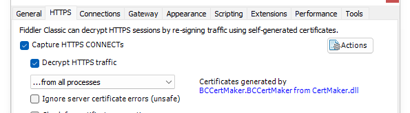Verify that the certificate creation preferences in Fiddler Classic are correctly configured as shown in the following example: