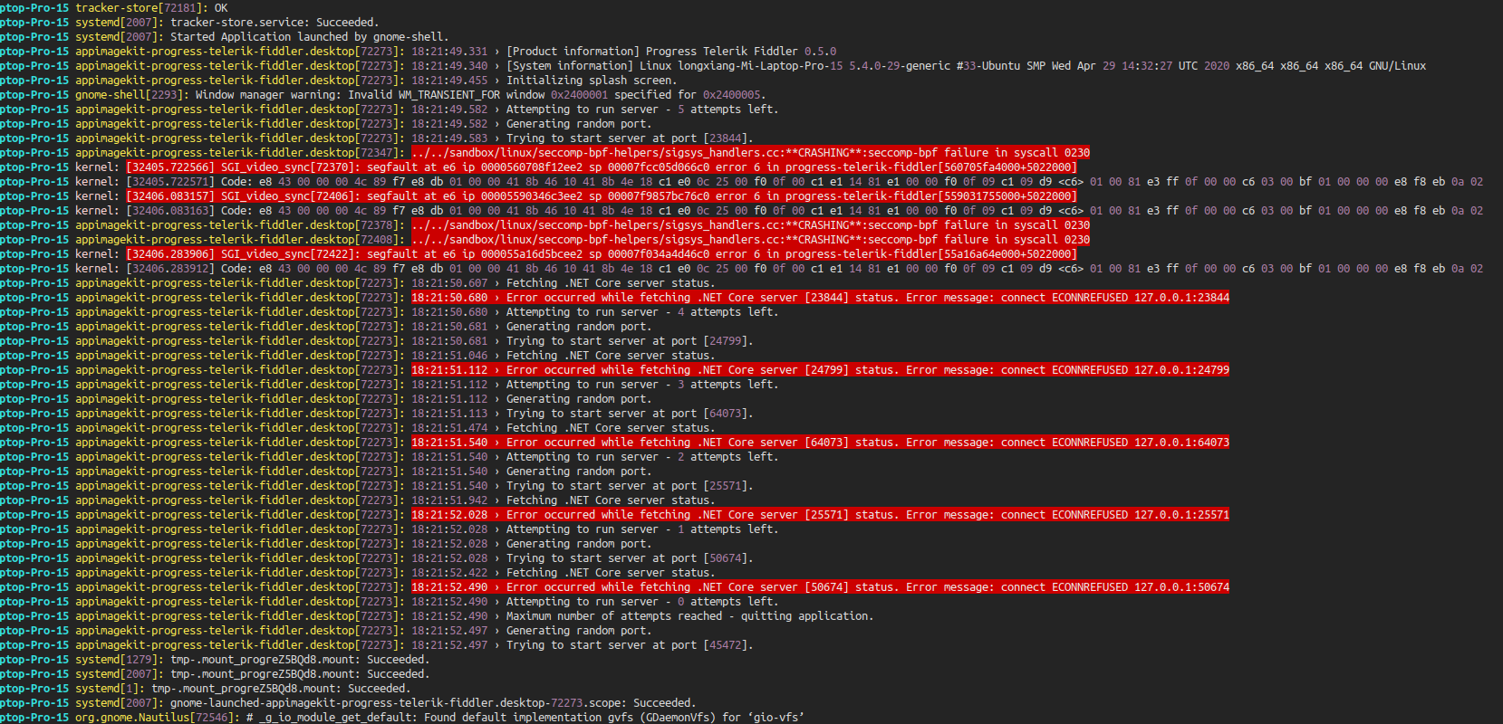zhaozhe@zhaozhe-MRC-WX0:~/soft$ ./progress-telerik-fiddler.AppImage 16:57:14.645 › [Product information] Progress Telerik Fiddler 0.5.016:57:14.654 › [System information] Linux zhaozhe-MRC-WX0 5.3.0-40-generic #32-Ubuntu SMP Fri Jan 31 20:24:34 UTC 2020 x86_64 x86_64 x86_64 GNU/Linux16:57:14.770 › Initializing splash screen.16:57:14.886 › Attempting to run server - 5 attempts left.16:57:14.886 › Generating random port.16:57:14.887 › Trying to start server at port [42420].16:57:16.046 › Fetching .NET Core server status.16:57:16.120 › Error occurred while fetching .NET Core server [42420] status. Error message: connect ECONNREFUSED 127.0.0.1:4242016:57:16.120 › Attempting to run server - 4 attempts left.16:57:16.120 › Generating random port.16:57:16.120 › Trying to start server at port [39650].16:57:16.540 › Fetching .NET Core server status.16:57:16.626 › Error occurred while fetching .NET Core server [39650] status. Error message: connect ECONNREFUSED 127.0.0.1:3965016:57:16.626 › Attempting to run server - 3 attempts left.16:57:16.627 › Generating random port.16:57:16.627 › Trying to start server at port [26748].16:57:17.066 › Fetching .NET Core server status.16:57:17.150 › Error occurred while fetching .NET Core server [26748] status. Error message: connect ECONNREFUSED 127.0.0.1:2674816:57:17.150 › Attempting to run server - 2 attempts left.16:57:17.150 › Generating random port.16:57:17.150 › Trying to start server at port [12887].16:57:17.575 › Fetching .NET Core server status.16:57:17.648 › Error occurred while fetching .NET Core server [12887] status. Error message: connect ECONNREFUSED 127.0.0.1:1288716:57:17.648 › Attempting to run server - 1 attempts left.16:57:17.648 › Generating random port.16:57:17.648 › Trying to start server at port [34621].16:57:18.067 › Fetching .NET Core server status.16:57:18.140 › Error occurred while fetching .NET Core server [34621] status. Error message: connect ECONNREFUSED 127.0.0.1:3462116:57:18.140 › Attempting to run server - 0 attempts left.16:57:18.140 › Maximum number of attempts reached - quitting application.16:57:18.156 › Generating random port.16:57:18.156 › Trying to start server at port [58068].