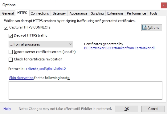 - Options -> HTTPS tab -> "Actions" -> ”Trust Root Certificates"