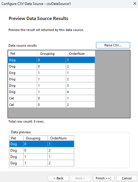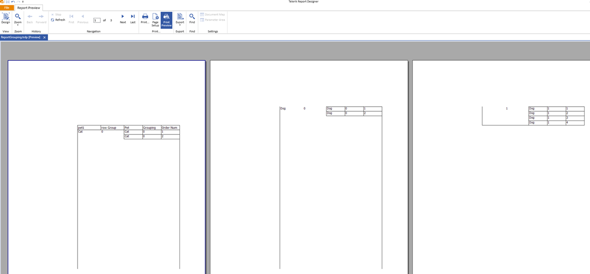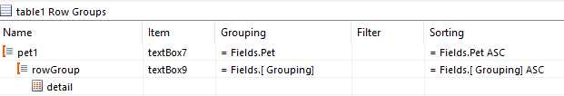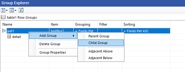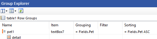 I tried making a group header for Pet, with a child of Grouping and then putting a page break at the bottom of the Grouping group but that didn’t work. I always get the result at the bottom here.