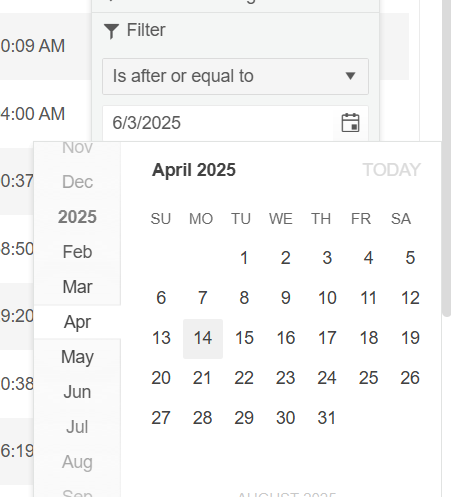In KendoReact Grid version 4.8.0, the date picker used in the filter menu exhibits inconsistent behavior. e.g. When a date is selected from the calendar (as shown in the first image, April 14, 2025), the value is not accurately applied to the filter input field. Instead, a different date (7/14/2025) appears in the input field (second image), which does not match the user's selection.