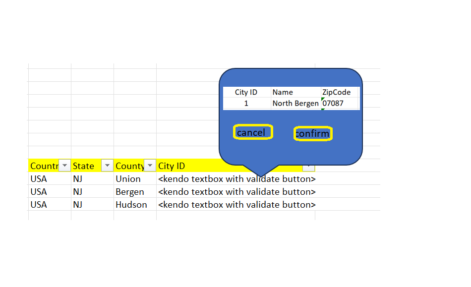 2. confirmation dialog will have the city id with details as Name and Zipcode, as shown in image