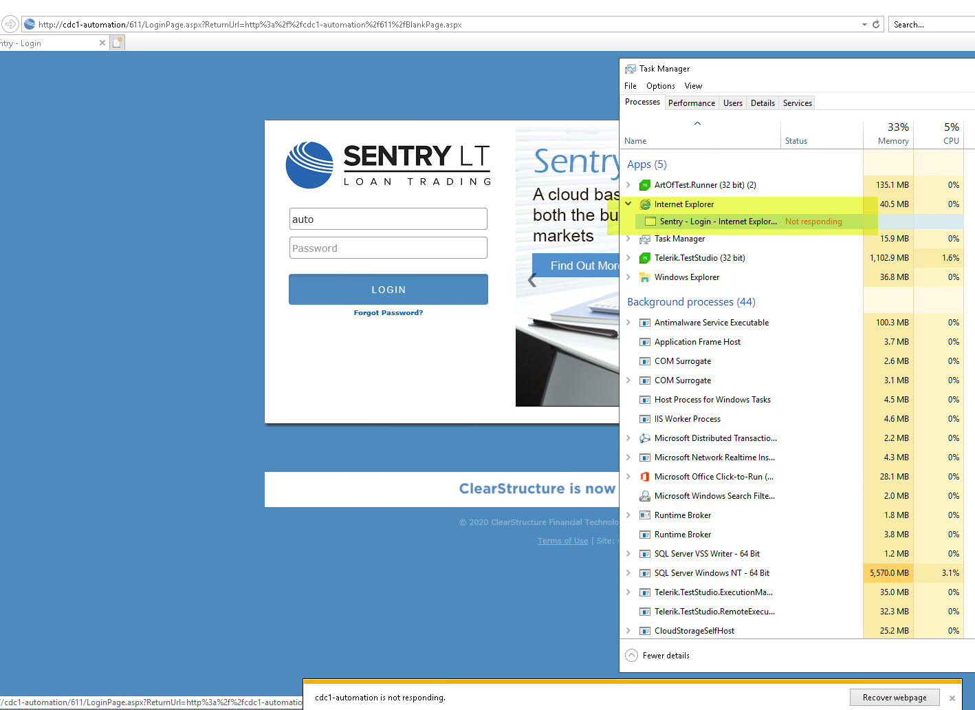 Tests run "without" any issues using Windows 7, now we are trying to test SL application with Windows 10 / Windows Server 2019 but IE has stopped working during test execution (see attached). Every time I run a test, at some point of time it gives "***** is not responding recover webpage" error message and failing test. There is no consistency, where it fails either Silverlight or ASP pages.