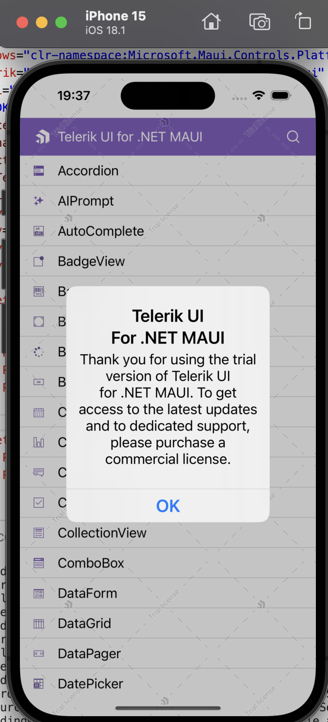 The app launches, an alert dialog injected by telerik is shown with the "this is a trial" information.