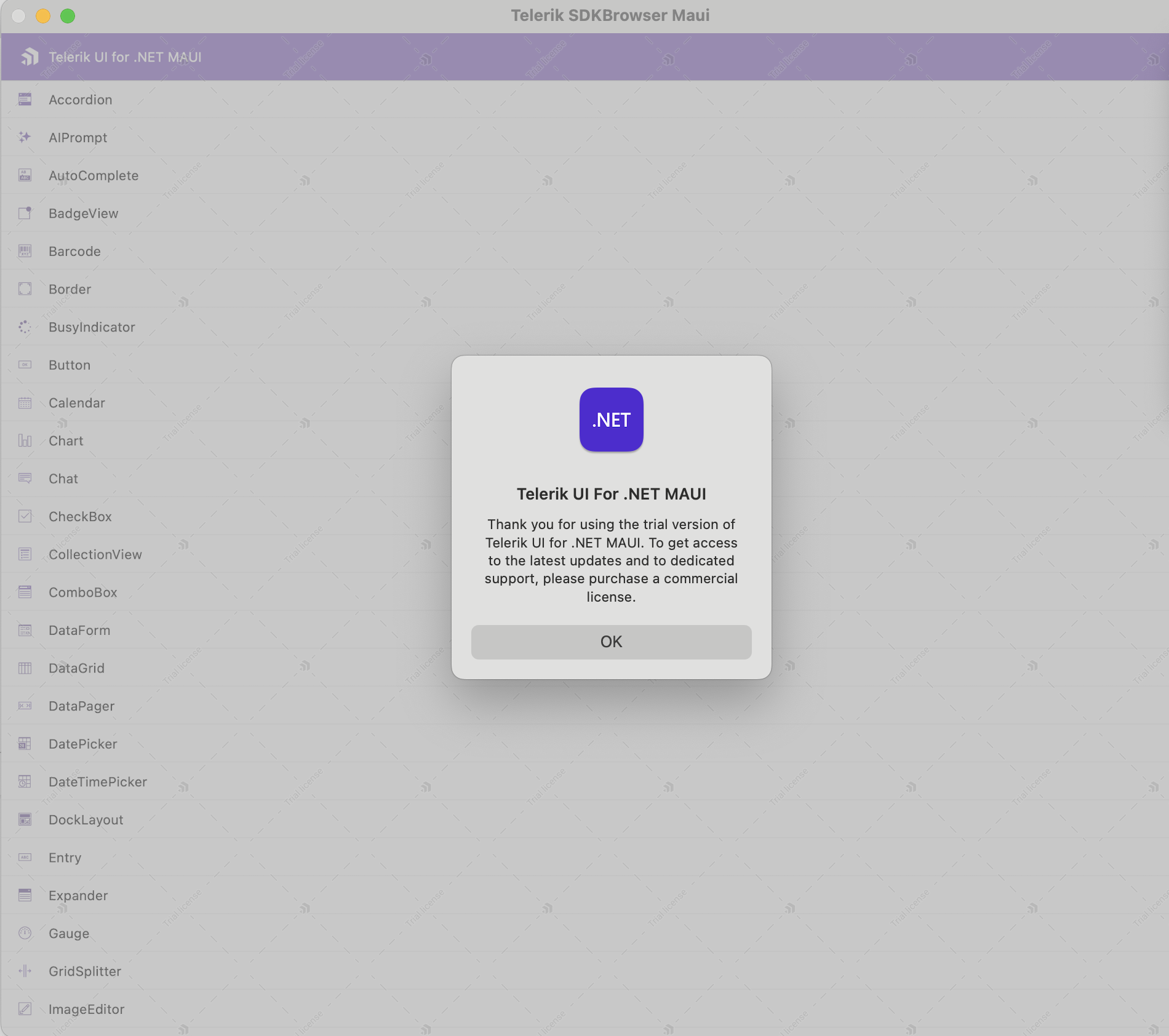 [0:] An error occurred: 'Object reference not set to an instance of an object.'. Callstack: ' at Telerik.Maui.Controls.TelerikLicense.<>c__DisplayClass12_0.<ShowLicenseMessage>b__1()