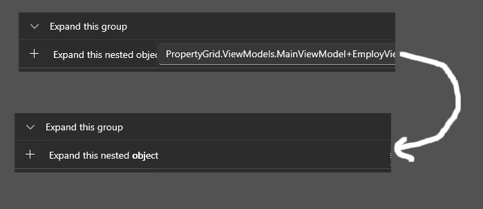 Here is the example where i tested it is Property grid. Basically we want to have object "Expand this nested object" look the same like the group "Expand this group"