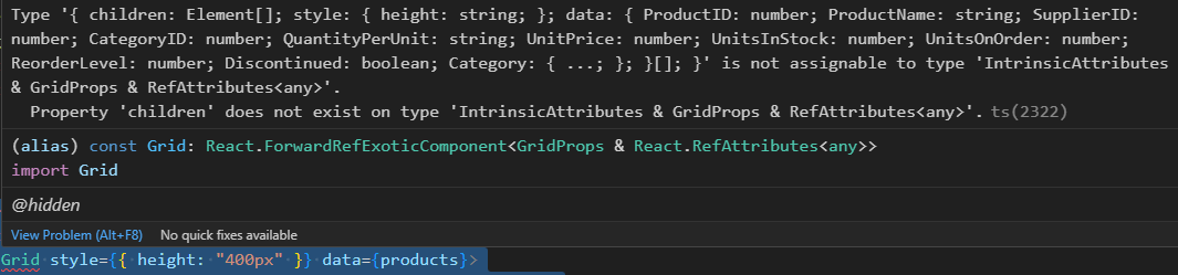 import * as React from "react"; import * as ReactDOM from "react-dom"; import { Grid, GridColumn } from "@progress/kendo-react-grid"; import products from "./products.json";export const KindoRactApp = () => {return (<Grid style={{ height: "400px" }} data={products}><GridColumn field="ProductID" title="ID" width="40px" /><GridColumn field="ProductName" title="Name" width="250px" /><GridColumn field="Category.CategoryName" title="CategoryName" /><GridColumn field="UnitPrice" title="Price" /><GridColumn field="UnitsInStock" title="In stock" /></Grid>);};