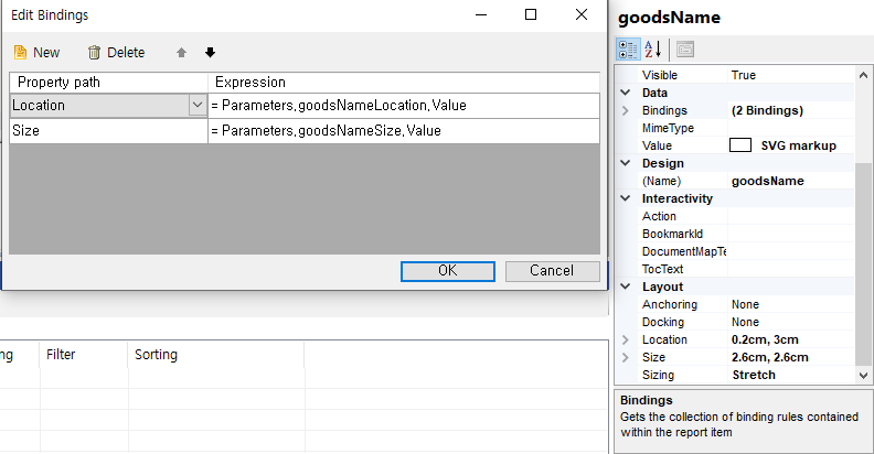 2. The green box on the Report Print View screen is the size and location of the goodsName currently set to the Report Parameter.