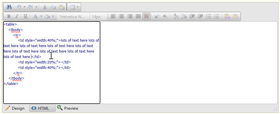However, I am still having problems with the HTML edit mode. The content is surrounded by a too narrow border/container. When entering large amounts of text, it wraps and is hard to read. Is there any way to remove this border/container, or make it wider, so that the whole width of the RadEditor is available for HTML content?