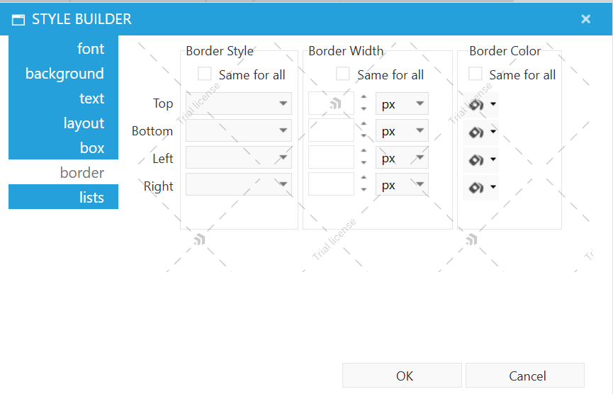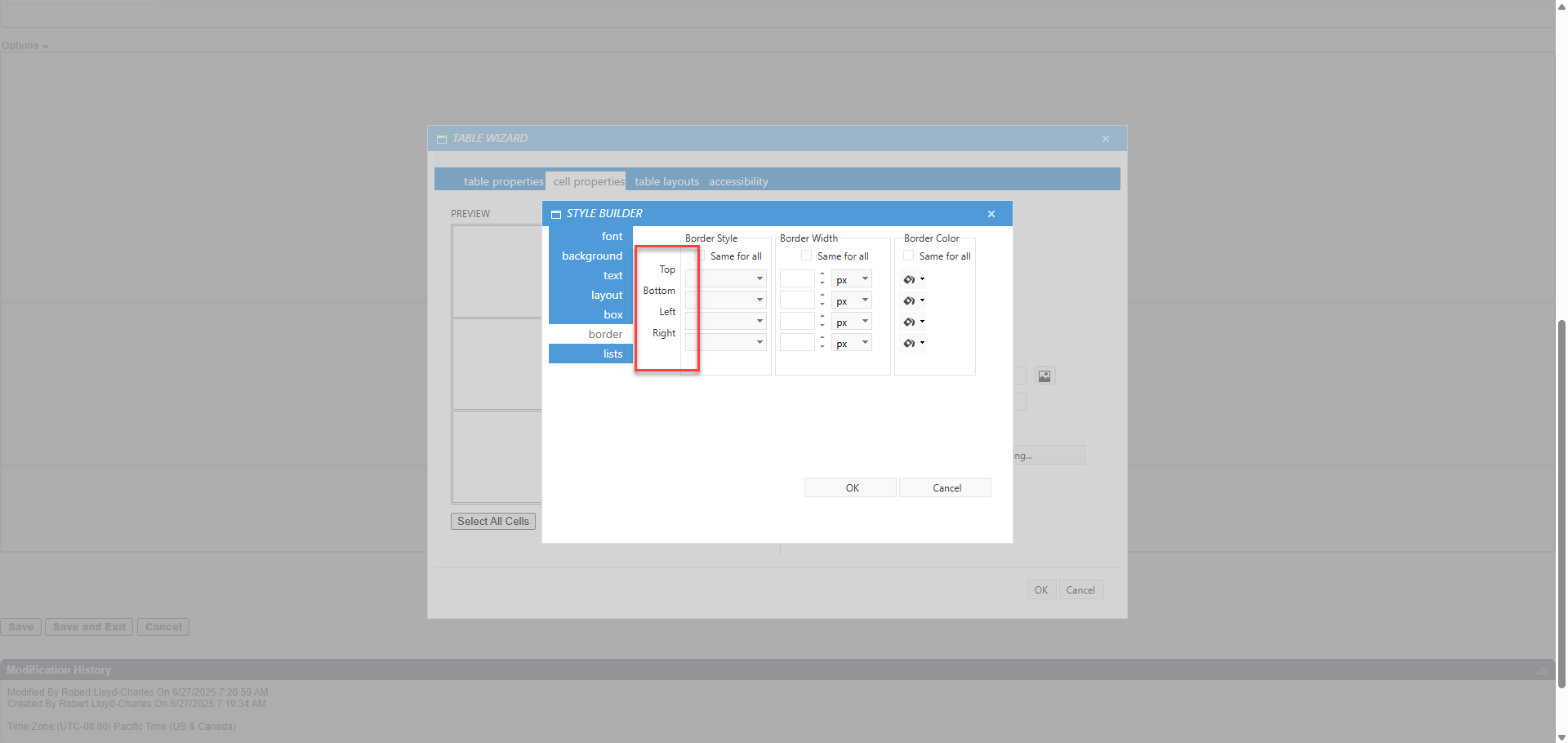 5. From the widget/page > select the middle bottom cell (notice it has no styling) > Table properties > Cell Properties > Select the middle bottom cell again > More Cell Styling > Border > Notice that the top row design is inherited > Is this expected?