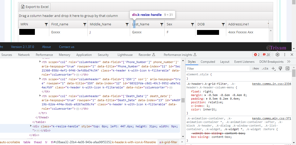 I recently encountered a specific issue related to the Kendo Grid component, more precisely, with the column resize cursor. Currently, when hovering over the column line in the Kendo Grid, the resize cursor is not showing as expected. Interestingly, we discovered that if we manually activate the cursor div using developer tools from the browser, the cursor starts working correctly. But this behavior is only temporary, and as soon as we close the developer tools, the issue reoccurs.