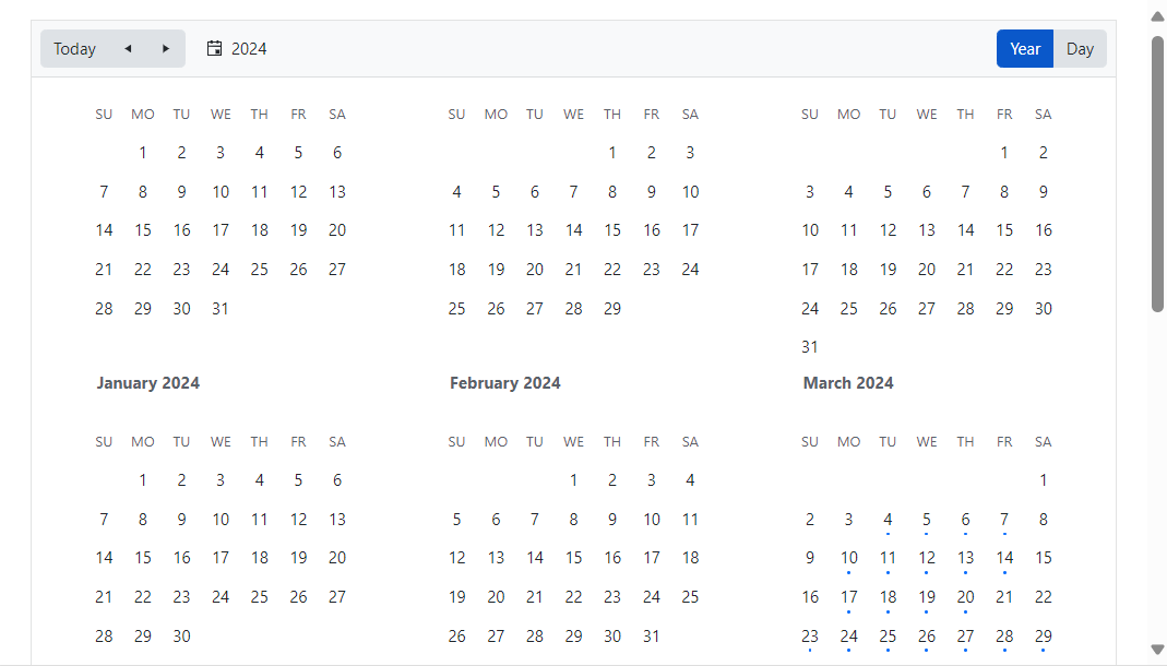 In addition to the design issue, I need to bind dynamic colors to the year view of the calendar. These colors will be fetched from an API. However, I'm unsure how to correctly implement this.