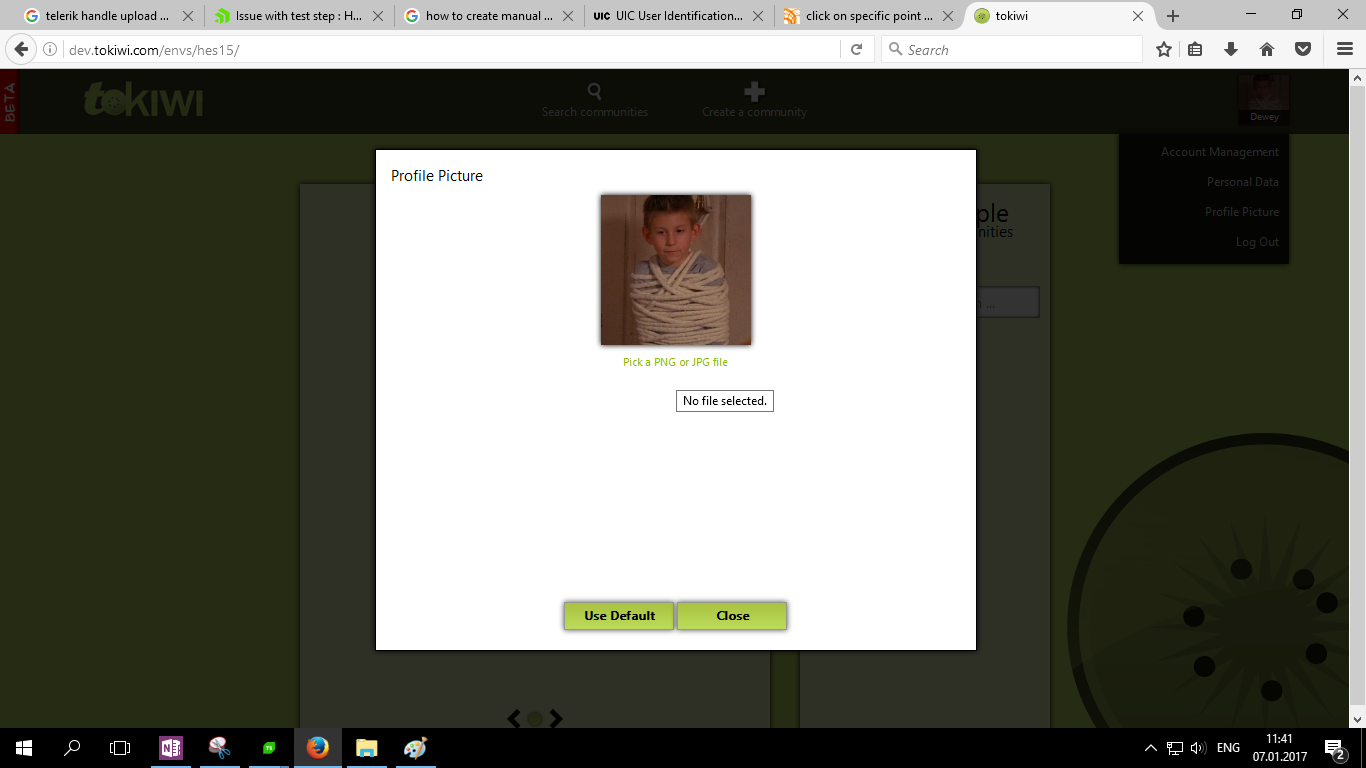 the website is http://tokiwi.com/. I am stuck at the point "handle Upload dialog". even though I followed the similar situation and its solution in this post, it could not make it through. When I click on the button "Profile Picture", a new popup is displayed with