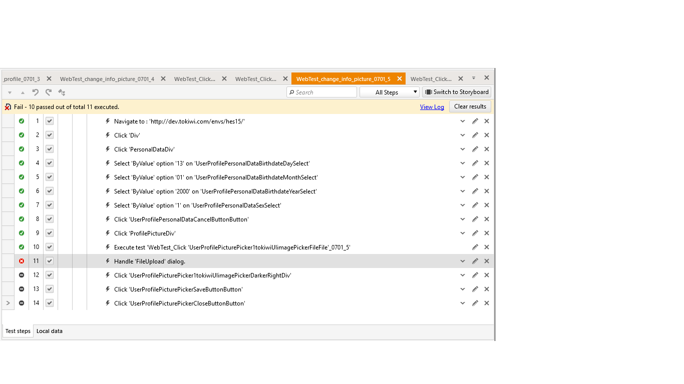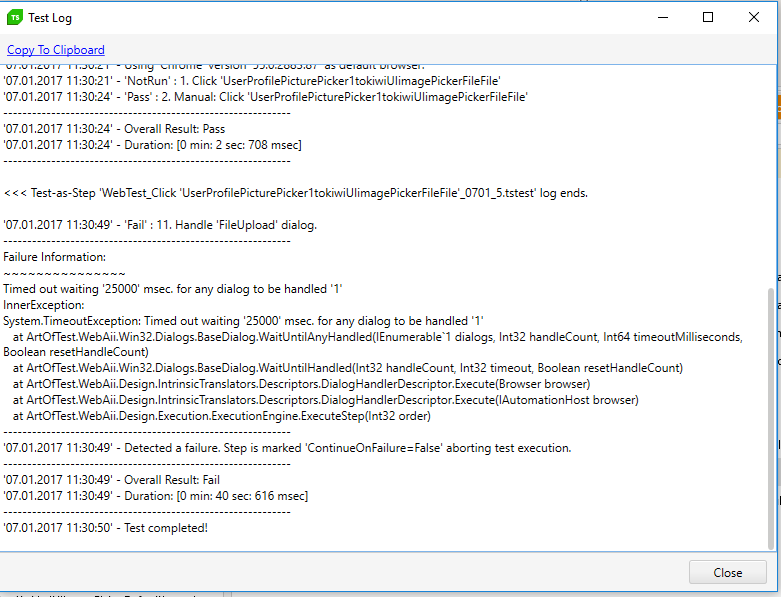 While executing, the dialog box doesn't appear even though the test step 'click select file' passes. The test execution hangs at Handle 'FileUpload' dialog step.