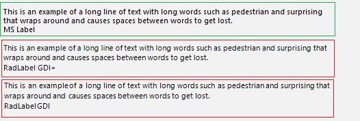 this.radLabel3.UseCompatibleTextRendering = false;That is why in this case the MS Label (the first one at the top) and the bottom RadLabel with HTML-like text offer different text rendering: