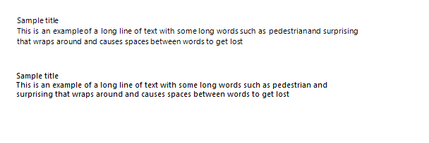 string text = "This is an example of a long line of text with long words such as pedestrian and surprising that wraps around and causes spaces between words to get lost.";