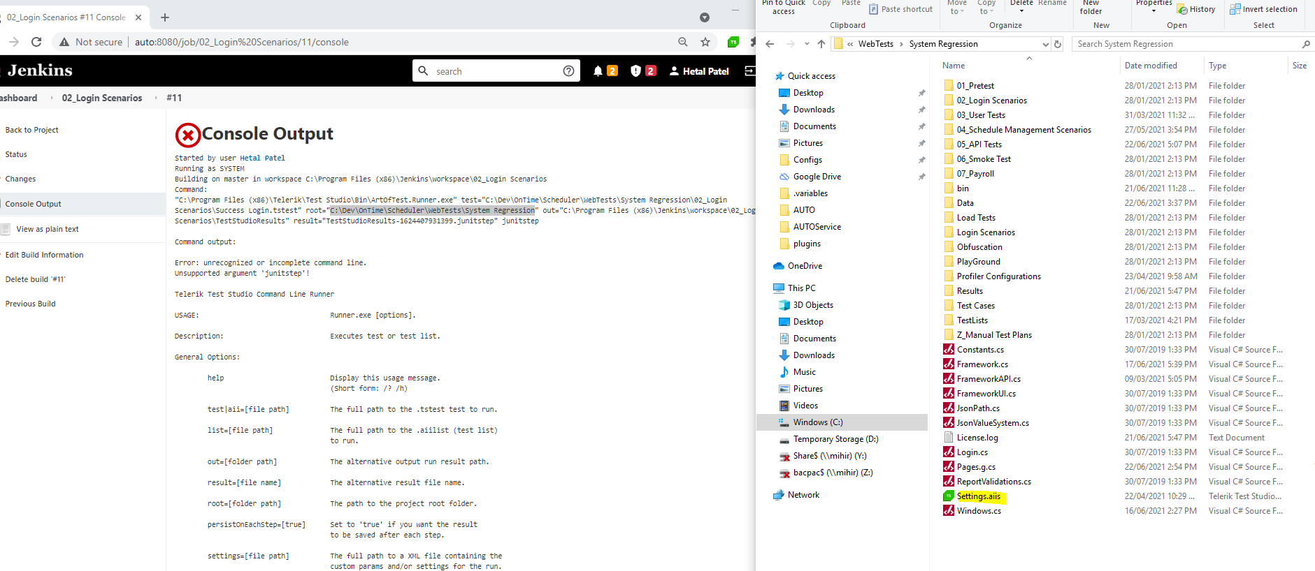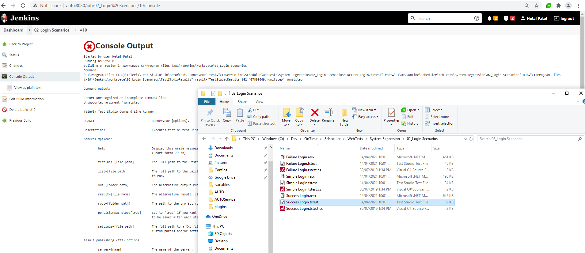 Running as SYSTEM Building on master in workspace C:\Program Files (x86)\Jenkins\workspace\02_Login Scenarios Command: "C:\Program Files (x86)\Telerik\Test Studio\Bin\ArtOfTest.Runner.exe" test="C:\Dev\OnTime\Scheduler\WebTests\System Regression\02_Login Scenarios\Success Login.tstest" root="C:\Dev\OnTime\Scheduler\WebTests\System Regression\02_Login Scenarios" out="C:\Program Files (x86)\Jenkins\workspace\02_Login Scenarios\TestStudioResults" result="TestStudioResults-1624407009049.junitstep" junitstep Command output: Error: unrecognized or incomplete command line. Unsupported argument 'junitstep'!