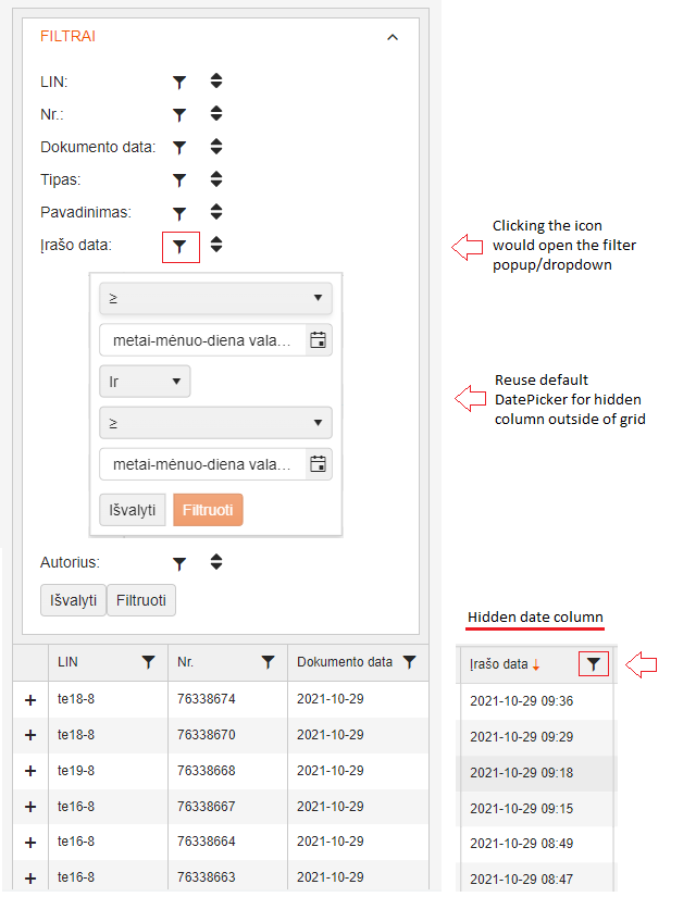 The desired functionality is that when the screen is resized to a tablet or mobile size, that some of the grid columns would be hidden without horizontal scroll, but the ability to filter them should remain. All of the hidden data would be shown by clicking "+" icon in the grid.