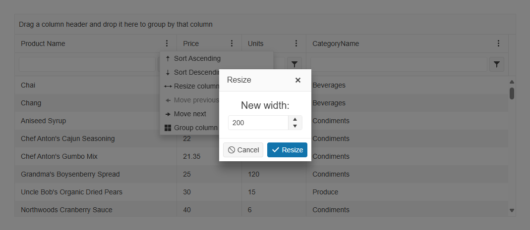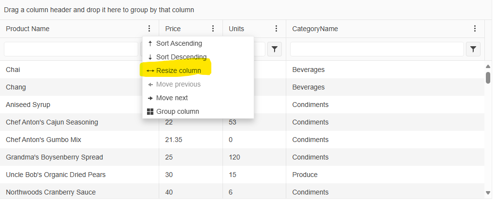 Is resize column menu item is added in kendo angular grid version 6.1.3? If yes, then please share me the reference to implement the column resize in column menu options.