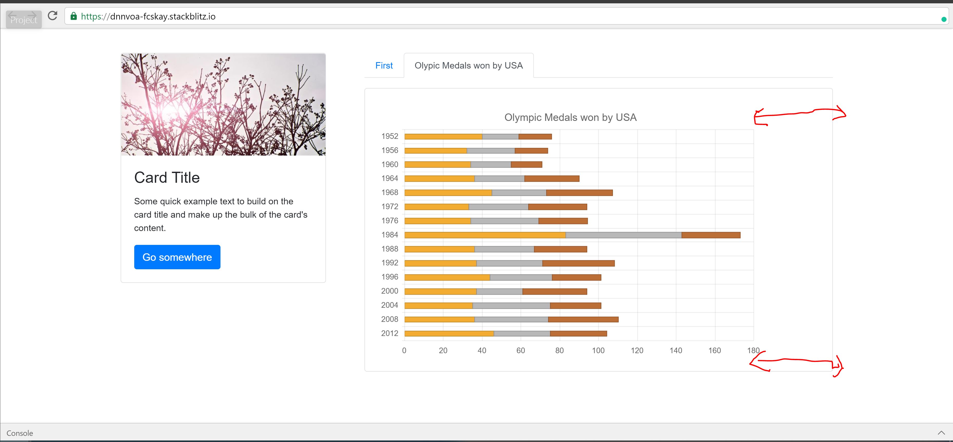 Here, when the second tab that is <b-tab title="Olypic Medals won by USA"> doesn't occupy the full width of the bootstrap cards that is inside the tabs.