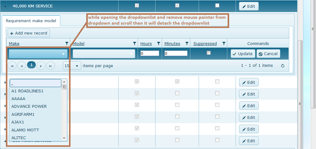 I am facing an issue on scroll of the page when the drop down was opened while edit/add in grid. (See attachment)