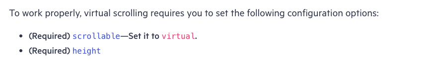 I have 2 Kendo Grids in my Angular application. In the 1st one, I use "virtual scrolling" because we have a lot of data (e.g. 10K records). The 2nd one is a "basic" Kendo Grid.