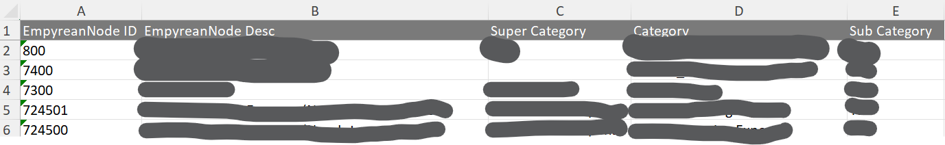 Due to security concerns I can't provide the excel but I am just attaching the below screenshot and masking the specific data and ID is a dummy data so i didn't mask it.