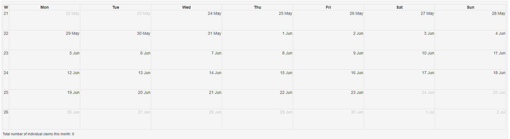 When viewing a month any dates outside the range should be disabled so for example if viewing May 2023 where May 24th is a Wednesday and the week begins on Mondays then May 22nd and 23rd would be disabled and as Jun 23rd is a Friday June 24th and 25th would be disabled.