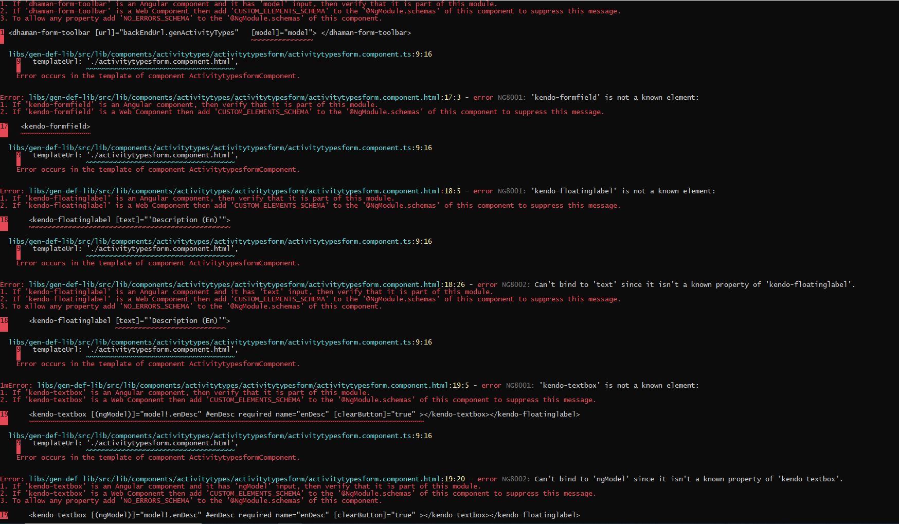 2. If 'kendo-formfield' is a Web Component then add 'CUSTOM_ELEMENTS_SCHEMA' to the '@NgModule.schemas' of this component to suppress this message.