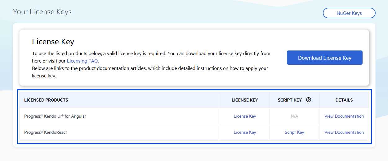 I've reviewed the cause of the error message listed at kendo-angular-ui/components/licensing/license-errors-and-warnings and have verified that I have an active license for Kendo UI for Angular, as shown below: