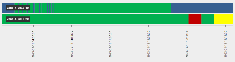 I have a stacked bar chart that I want to use to emulate changes in activity. Say the chart spans 30 minutes. I want the stacks to show when each category changed activity and for how long. For example, Zone 4 Cell 10 might be active for 5 minutes, inactive for 10 minutes and then active again for 15 minutes. Zone 4 Cell 20 might have a very different activity timeline. All activities are known (eg "active", shown below as green). An example is shown below.