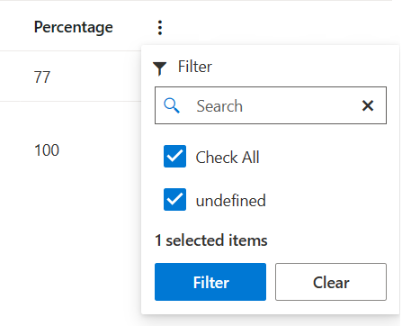 I am using the React Data Grid component and have a grid column with a custom cell renderer. I want to be able to filter on this column using the GridColumnMenuCheckboxFilter. However, the filter only shows an option of 'undefined' and not the values rendered by the custom cell component (see image below). The rendered values are not coming from a direct property of the grid data object, so I was wondering if there is a possibility to define a valueGetter that outputs the actual rendered value, which can then be picked up by the filter component?