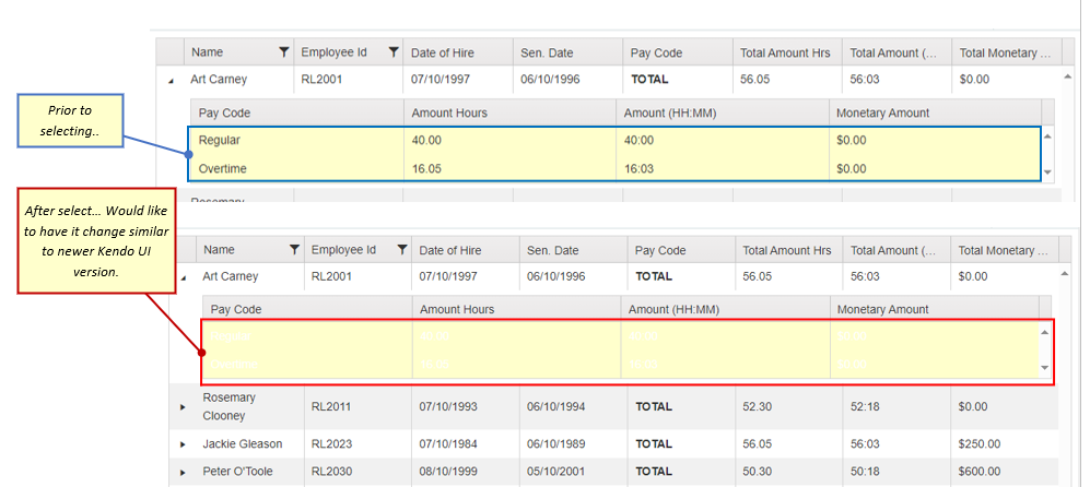 How can I change the older Kendo UI so it looks more like the newer version? So when selected the background color changes enough that the letters are visible in front of the background color? I am guessing there is a way to do this via a cascading style sheet?