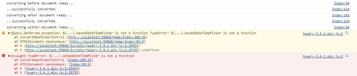 When the following code is run, I get an error in the console indicating that .kendoDateTimePicker is not a function, but the controls render when the convertNewPickerControl() method is called outside the $(document).ready() function.