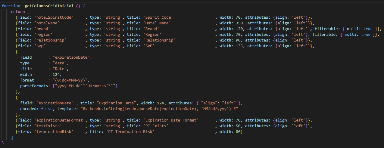 my column defination for kendo grid
