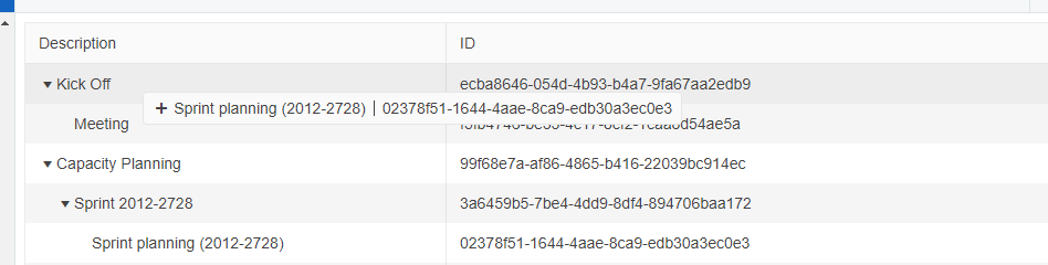 Drag "Sprint planning (2012-2728)" and drop it to "Kick off" as per image belowAfter the drop the e.position should be "over" and I expect the row will appear inside "Kick Off" node and not as a parent itself. In the drop event after the "over" I will have my own logic to perform certain task.