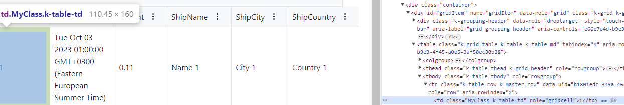 .Columns(columns => { foreach (System.Data.DataColumn dcolumn in Model.Columns) { columns.Bound(dcolumn.ColumnName).HtmlAttributes(new {@class = "MyClass" }).Title(dcolumn.Caption); } })This would then produce the following result within the DOM: