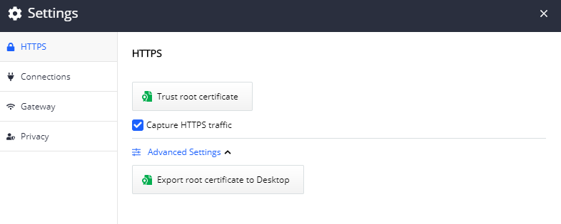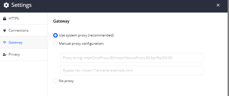 4. Can you share screenshots of the HTTPS, Connections and Gateway Tabs in the Fiddler Everywhere Configuration Settings as shown below screenshot.